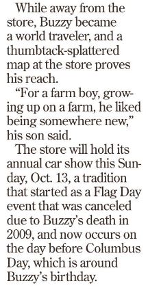 Here is the Enterprise article written by Dan Belson.  He visited the Store last Tuesday when we were celebrating Charlie Simms’ 93rd birthday and wanted to interview me for the article.  I asked him if I could catch up with him some other time because with a Store full of folks I couldn’t really talk to him at that time.  I called him Wednesday morning and this was his summary of our conversation. Dan did a good job and in particular I like his reference to the Buzzy birthday celebrations as being a “backward tradition.” Guess we could say that about Buzzy’s Country Store in general.